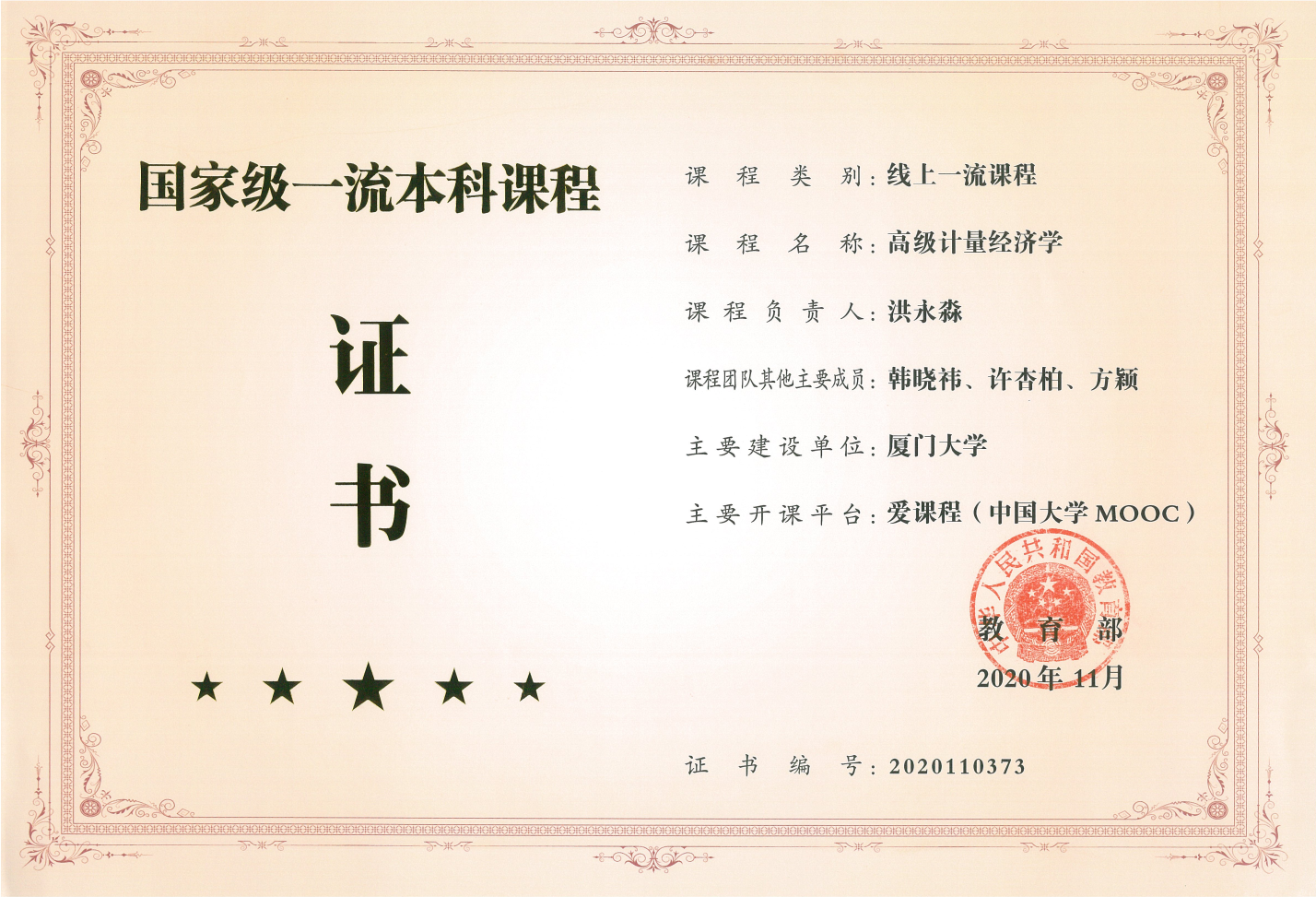 2020年11月24日教育部公布首批国家级一流本科课程名单,洪永淼负责的《高级计量经济学》入选线上一流课程。
